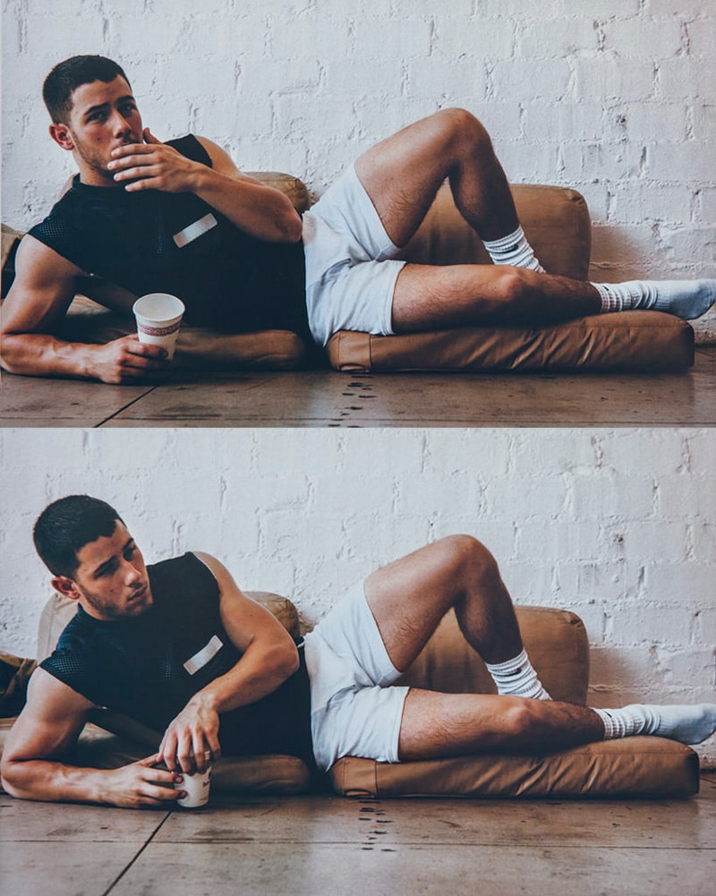 The setup is simple but sharp. City backdrop, perfect skin, enough fabric to keep it legal. Oita knows how to let the subject breathe without letting the shot fall flat. Nick is being seen, and looking good while doing it.